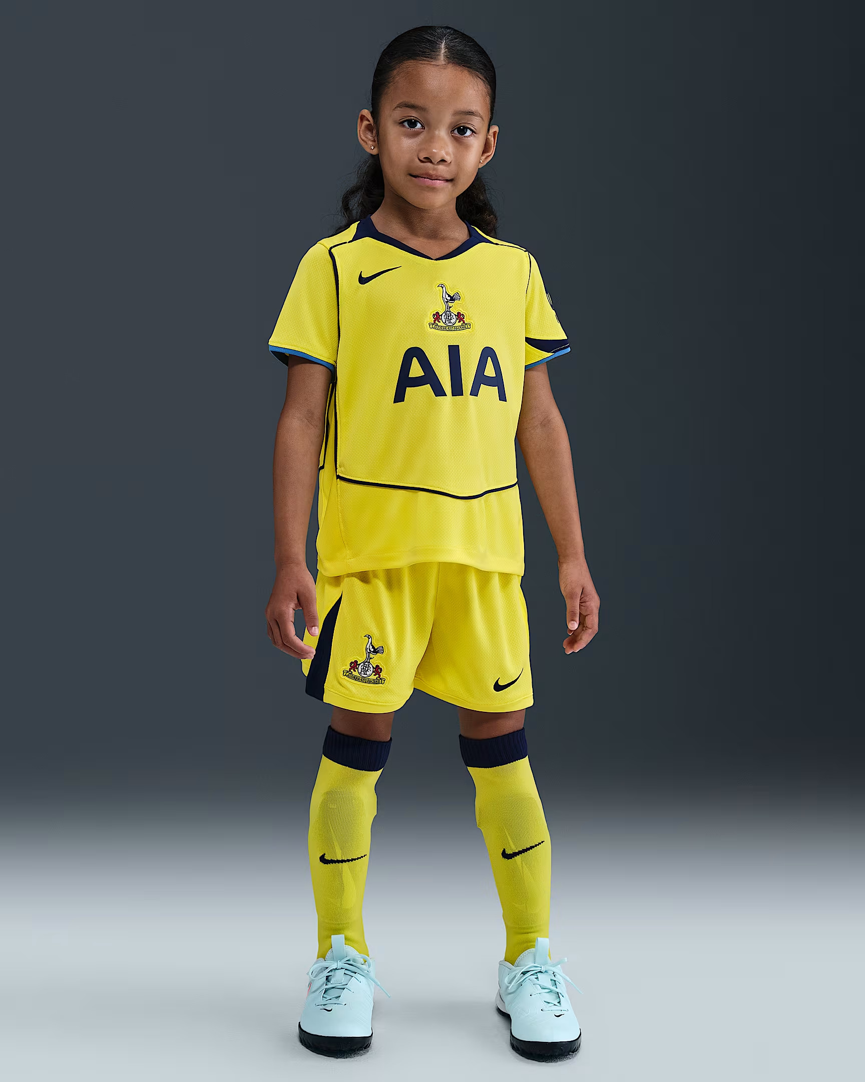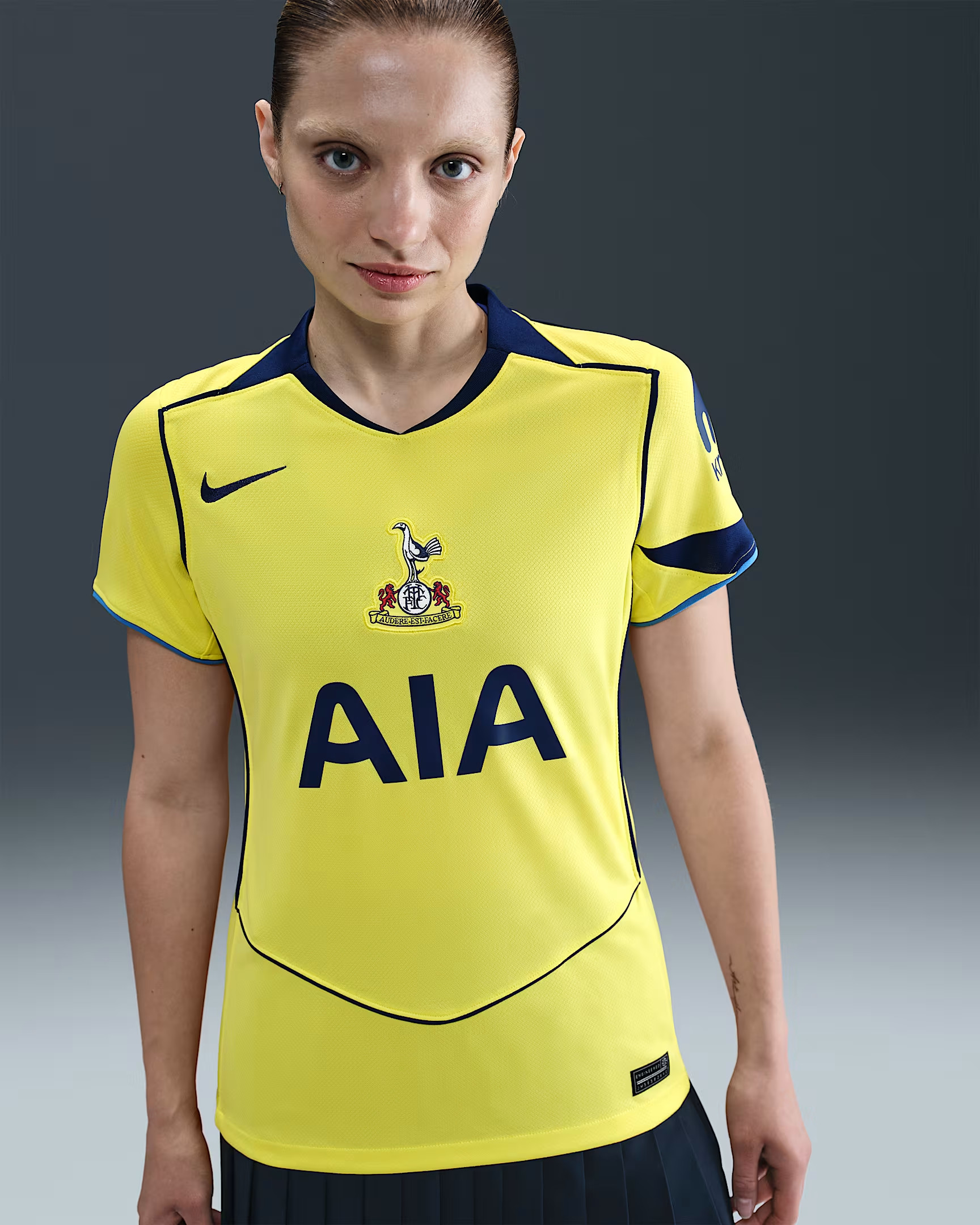 Het Tottenham Hotspur 3e shirt 2025-2026 is geel en wordt gekenmerkt door de navy blauwe (Blue Void ) en blauwe (Pacific Blue) accenten. De marineblauwe details komen terug in de de naden op de zijkanten van het shirt die richting de kraag lopen en ook net boven de onderkant van het shirt eindigen. De contrastlijnen aan de onderkant van de mouwen zijn daarentegen blauw. Deze naden/contrastlijnen zijn iconisch voor het Total90 template en komen ook terug op de achterzijde van het shirt. Een ander kenmerk van het template is de v-hals zonder omslag. De v-hals van het Tottenham Hotspur 3e shirt 2025-2026 is ook navy blauw, een kleur die ook terug komt in het vlak op de linkermouw en de swoosh van Nike op de rechterborst. De swoosh is net iets hoger geplaatst dan we gewend zijn, wat ook weer kenmerkend is voor het Total90 template. Op het midden van de borst prijkt de badge van Tottenham Hotspur. Dit is niet het moderne clublogo, maar het logo van de periode 1999-2006. Dit logo prijkt voor het eerst sinds twintig jaar weer op een voetbalshirt van Tottenham Hotspur. Last but not least, is het Total90 logo verwerkt aan de binnenkant van de hals.