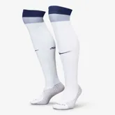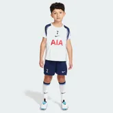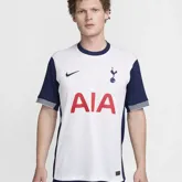 Het Nike Tottenham Hotspur thuisshirt 2024-2025 viert het DNA van de club en is bovendien een verwijzing naar de rijke heritage van de club. Ook dit jaar is het thuisshirt van de ‘’Lilywhites’’ weer overwegend wit, maar speelt ook donkerblauw een prominente rol in het tenue. De mouwen zijn namelijk donkerblauw en hetzelfde geldt voor de ronde hals en de band op de zijkanten van het voetbalshirt. De mouwen bevatten aan de onderkant een witte band met dunne donkerblauwe lijntjes om het retro gevoel tot leven te brengen! Alle logo’s staan op de gebruikelijke plekken. De rechterborst bevat een donkerblauwe swoosh en de linkerborst het clublogo. Hoofdsponsor AIA versiert het midden van het Tottenham Hotspur thuisshirt en ook dit jaar is het logo van de shirtsponsor weer rood. De binnenkant van de hals is weer uitgerust met een detail. De gouden taping aan de binnenkant van de hals bevat namelijk de initialen van de leus van de supporters: COYS (Come On You Spurs), de naam van de club en het Nike logo. Het Tottenham Hotspur thuistenue 2024-2025 wordt gecompleteerd door een donkerblauw voetbalbroekje met aan de onderkant een witte band met dezelfde dunne streepjes als in de biesjes van de mouwen. De shorts zijn ook weer uitgerust met de logo’s van de club en Nike. De sokken van het thuistenue zijn wit en bevatten aan de bovenkant weer hetzelfde design van dunne strepen en een donkerblauwe band.