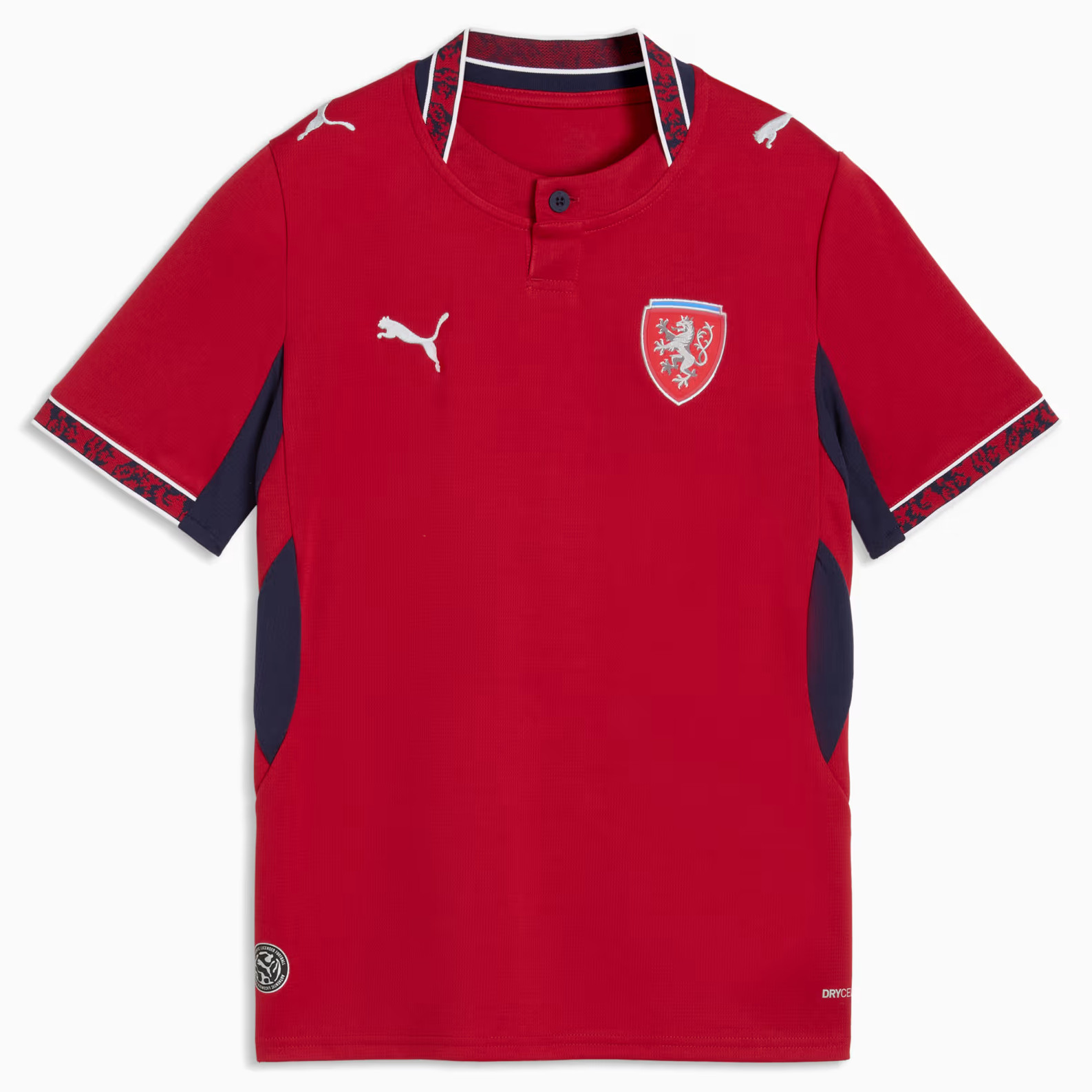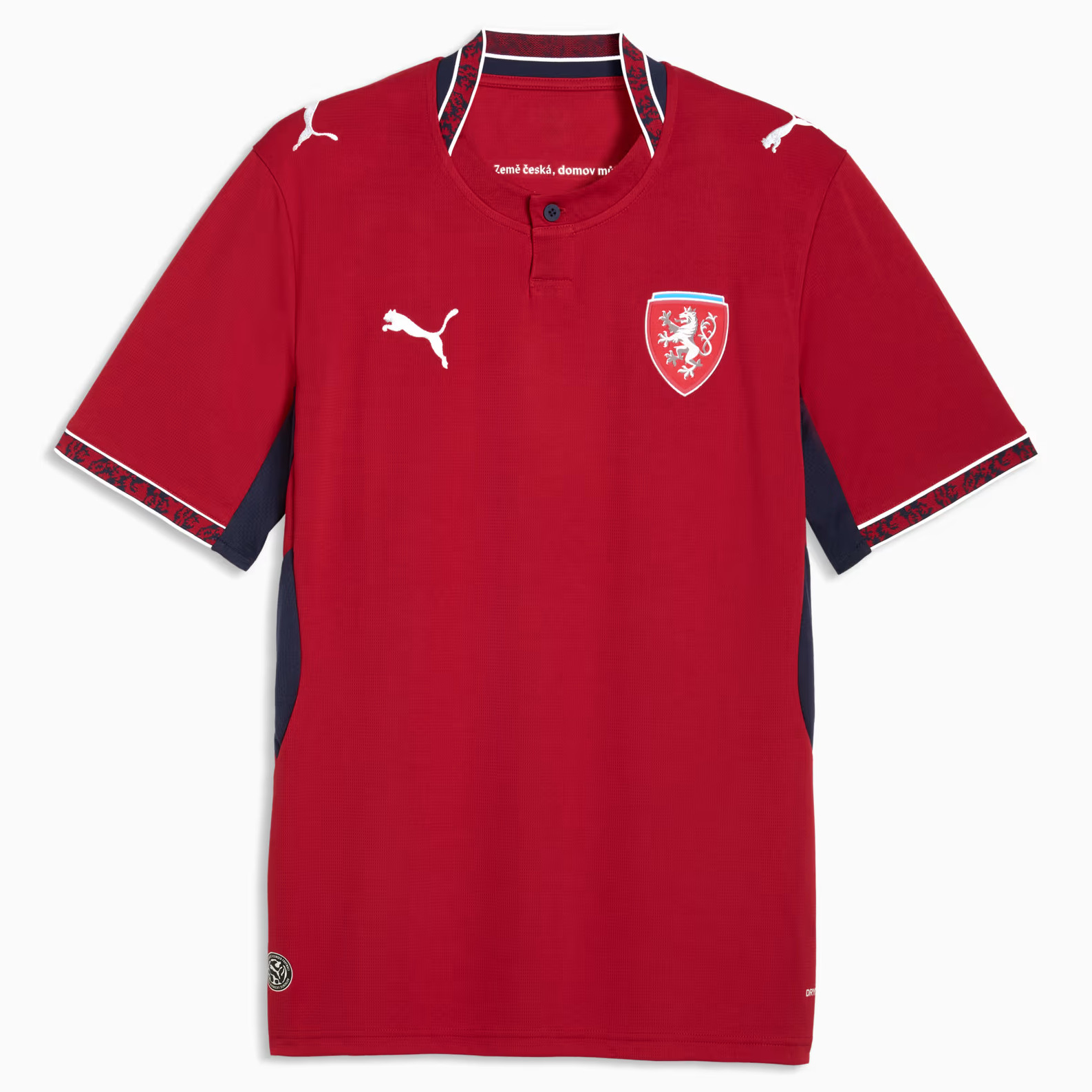 Het Tsjechië thuisshirt is donkerrood en bevat een klassieke henley collar met een knoopje. Het shirt valt vooral op door het patroon, die in de band aan de onderkant van de mouwen en aan de achterkant van de hals is verwerkt. Deze band is rood en wordt geflankeerd door twee dunne witte lijnen. In de mouwboorden is een blauw patroon verwerkt met karakteristieke Tsjechische symbolen. Deze verwijzen naar traditionele folkloristische motieven die vaak terugkomen in Tsjechisch borduurwerk en klederdracht. Bovendien verwijst het patroon naar details van de iconische leeuw met dubbele staart uit het wapen van het land en het logo van de voetbalbond. Een graphic van deze leeuw prijkt ook op de achterkant van het shirt. De logo’s staan op de standaard plekken. De rechterborst en de mouwen zijn voorzien van het logo van Puma en de linkerborst bevat de badge van de nationale voetbalbond, de Fotbalová asociace České republiky (FAČR). Een ander detail staat aan de binnenkant van de hals van het shirt. Hier Hier prijkt de tekst: "Země česká, domov můj" (Tsjechische land, mijn thuis). Het Tsjechië thuistenue wordt compleet gemaakt door een wit voetbalbroekje, waarop ook de logo’s van de voetbalbond en Puma staan. De sokken van het tenue zijn blauw met op het midden het logo van Puma.