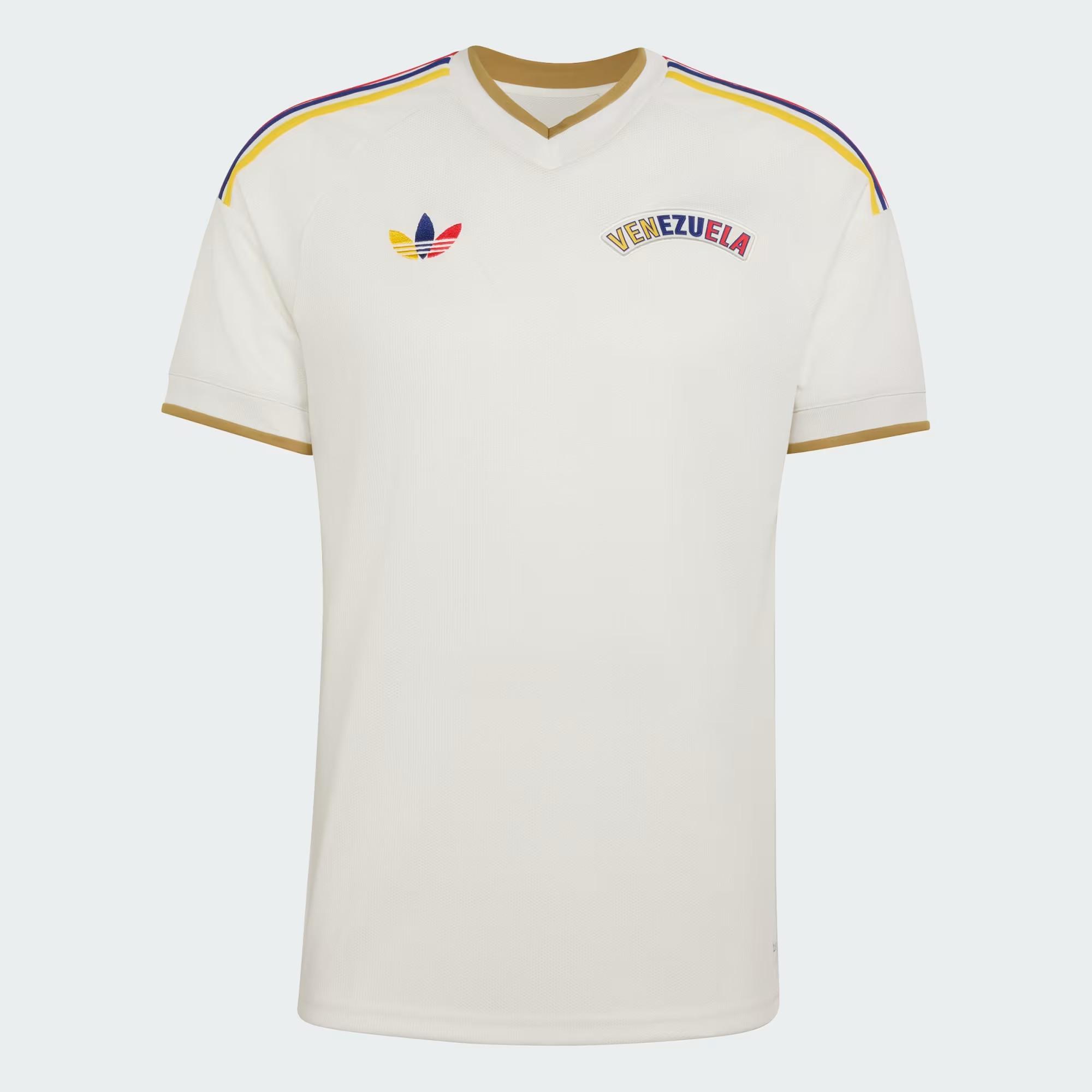 Het Venezuela uitshirt 2026-2027 is een echte blikvanger waarin historie en hedendaagse stijl samenkomen. Ook dit shirt staat volledig in het teken van het 100-jarig jubileum van de voetbalbond en ademt de sfeer van de gloriedagen uit de jaren '50, maar dan wel met een frisse en moderne twist. Het shirt is wit met rode, navy blauwe en gele accenten. Deze kleuren, geïnspireerd door de nationale vlag, zorgen voor een levendige uitstraling die direct in het oog springt. De adidas strepen op de schouders, de trefoil op de rechterborst en de naam van het land op de linkerborst dragen allemaal deze kenmerkende tinten. Het gebruik van retro logo’s onderstreept het nostalgische karakter van het shirt en geeft het geheel een authentieke uitstraling. Dit seizoen kiest adidas bewust voor een Originals benadering bij de uittenues. Daarom prijkt niet het performance logo, maar het klassieke adidas Originals logo op het shirt. Ook het embleem van de bond is in lijn met dit concept teruggebracht naar de essentie: geen modern wapenschild, maar enkel de naam, precies zoals het nationale elftal dit in de periode 1961-1967 droeg. Verder is ook dit shirt voorzien van gouden accenten, die verwijzen naar het jubileum van het nationale team. Deze kleur komt terug in de v-hals en de mouwboorden. Ook in de nek op de achterzijde van dit shirt prijkt de bijnaam van het nationale elftal: ‘’LA VINOTINTO’’. Het Venezuela uittenue 2026-2027 wordt compleet gemaakt door een wit short met de adidas strepen in dezelfde kleurencombinatie als op het shirt. Hetzelfde geldt voor de logo’s van de voetbalbond en adidas. De sokken zijn wit met rode, blauwe en gele details.