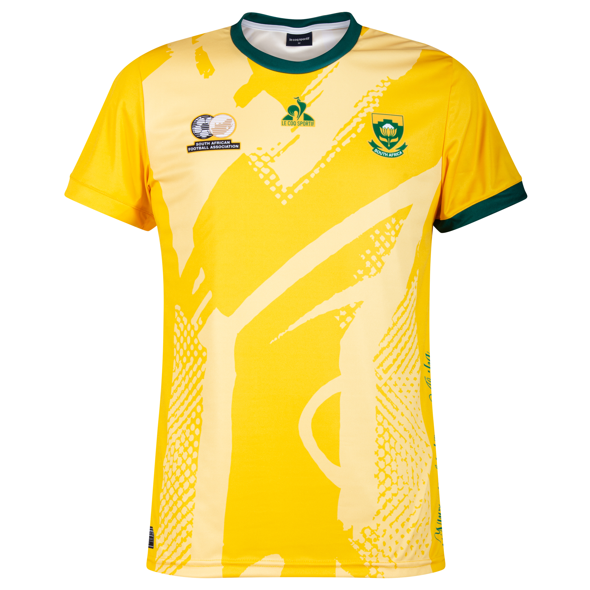 Het Zuid Afrika thuisshirt 2023-2024 is overwegend geel en bevat een all-over print van diagonale strepen en abstracte vormen. Daarnaast is het thuistenue uitgerust met groene accenten. De ronde hals en de band aan de onderkant van de mouwen zijn groen. Op het midden van de borst prijkt het logo van Le Coq Sportif en de rechterborst is uitgerust met het logo van de Zuid Afrikaanse voetbalbond (SAFA/ South Africa Football Association). De linkerborst bevat het wapen van Zuid Afrika, welke gekenmerkt wordt door de koningsprotea/Protea Cynaroides. Dit is de nationale bloem van Zuid-Afrika. Het thuistenue wordt compleet gemaakt door een geel voetbalbroekje en gele kousen.