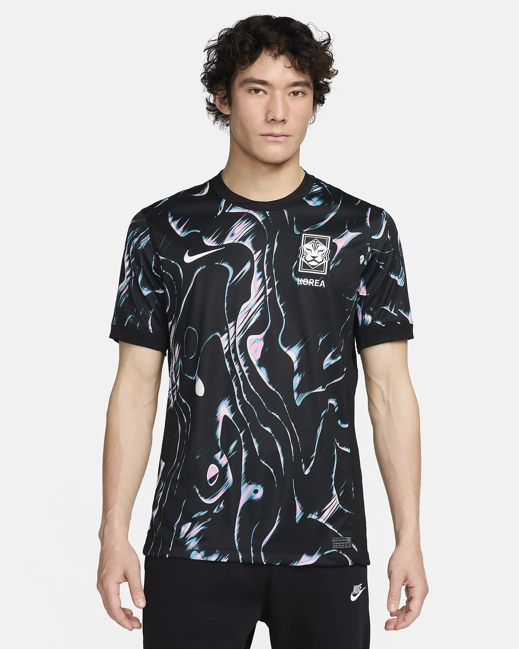 Het Zuid-Korea thuisshirt 2024-2025 is een moderne interpretatie van de artistieke tradities uit het verleden. Het traditionele rode thuisshirt heeft dit jaar plaats gemaakt voor een speelse roze editie. Het Zuid-Korea thuishirt bevat namelijk een all-over swirl print, die geïnspireerd is door de verschillende architectonische kuntswerken die het land rijk is. Bovendien is deze print een knipoog naar de zogenaamde taeguk, de blauw/rode cirkel of yin-yang symbool uit de nationale vlag. De cirkel staat in Zuid-Korea symbool voor de oorsprong van alles in het heelal. Het blauwe staat voor het negatieve en het rode voor al het positieve in het heelal. Daarnaast bevat het voetbalshirt zwarte en turquoise accenten. Het thuisshirt heeft namelijk een ronde hals met lijnen in deze kleurencombinatie. Ook in de band aan de onderkant van de mouwen zijn deze kleuren verwerkt. De panels op de zijkanten van het thuisshirt zijn turquoise, evenals de swoosh van Nike op de rechterborst. De linkerborst is weer uitgerust met het logo van de nationale voetbalbond. De tijger uit het logo van de voetbalbond inspireert het klauweffect aan de binnenzijde van de kraag. Dit effect vormt de naam van het land. Het thuistenue wordt gecompleteerd door een roze voetbalbroekje met aan de onderkant een zwarte en turquoise lijn. Deze kleurencombinatie komt ook terug in de sokken.