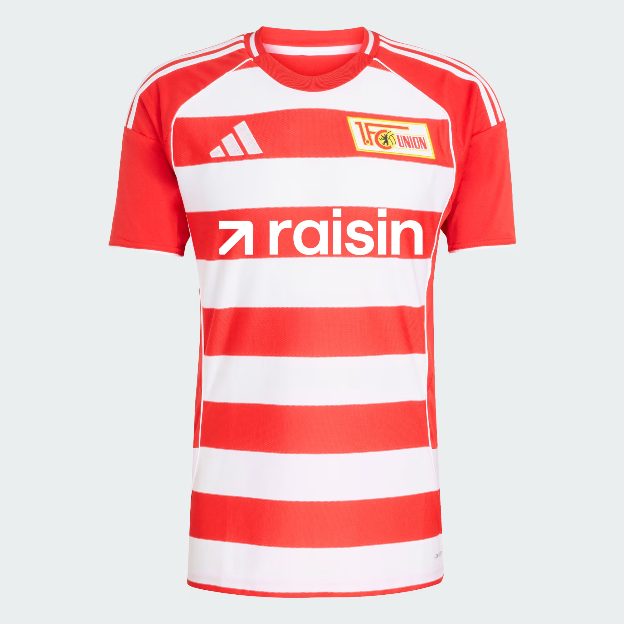 Check hier de nieuwste Union Berlin voetbalshirts! In deze voetbalshirts speelt de club uit de Duitse hoofdstad de Bundesliga, DFB Pokal en Europese wedstrijden. Union Berlin speelt de thuiswedstrijden in het Stadion An der alten Försterei, gelegen in de wijk Köpenick. FC Union Berlin is opgericht in 1966, maar de wortels van de club gaan al terug naar 1906. De primaire kleuren van Union Berlin zijn de kleuren van de stad Berlijn: rood en wit. Het Union Berlin thuisshirt is dan ook rood/wit. Het uitshirt en 3e voetbalshirt verschilt ieder jaar van kleur. De bijnaam van Union Berlin is ‘’Die Eisernen’’, wat symbool staat voor de vastberadenheid en de kracht van het team en de gepassioneerde supporters. In het seizoen 2019-2020 promoveerde de club voor het eerst naar de Bundesliga en in 2023-2024 speelde de club voor het eerst Champions League. Check hier alle beschikbare Union Berlin producten en check ook de historie van het Union Berlin voetbalshirts of de kleding- en shirtsponsors.