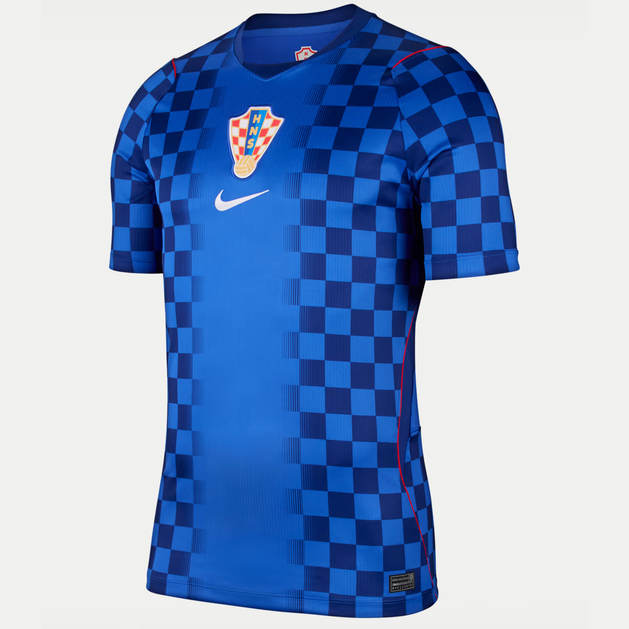 Het Kroatië WK 2026 uitshirt blijft trouw aan één van de meest herkenbare designs in het internationale voetbal: het iconische schaakbordpatroon. De blauwe en donkerblauwe blokken bevinden zich op de body van het shirt en zijn dit seizoen kleiner vormgegeven dan bij eerdere tenues. Het design valt vooral op door de centrale baan over het midden van het shirt. Deze baan vervaagt geleidelijk naar de zijkanten, waardoor de blokken naast deze baan een subtiel fading effect krijgen. In de vakjes zijn bovendien kleine strepen verwerkt, wat het shirt een dynamische en moderne uitstraling geeft. Daarnaast bevat het tenue rode accenten. Deze kleur komt terug in de naden ter hoogte van de schouders en langs de zijkanten van het shirt. De logo’s staan dit seizoen centraal op de borst. Op het midden prijkt de badge van de Kroatische voetbalbond, de Hrvatski nogometni savez (HNS). Daaronder staat de swoosh van Nike. Aan de binnenzijde van de hals bevindt zich nog een subtiel detail met het schild van de Kroatische voetbalbond en de tekst: Obitelj Family. Dit voetbalshirt bestaat voor 100% uit polyester en is uitgerust met de Nike AeroFit technologie, welke zorgt voor de afvoer van vocht en voor ventilatie.