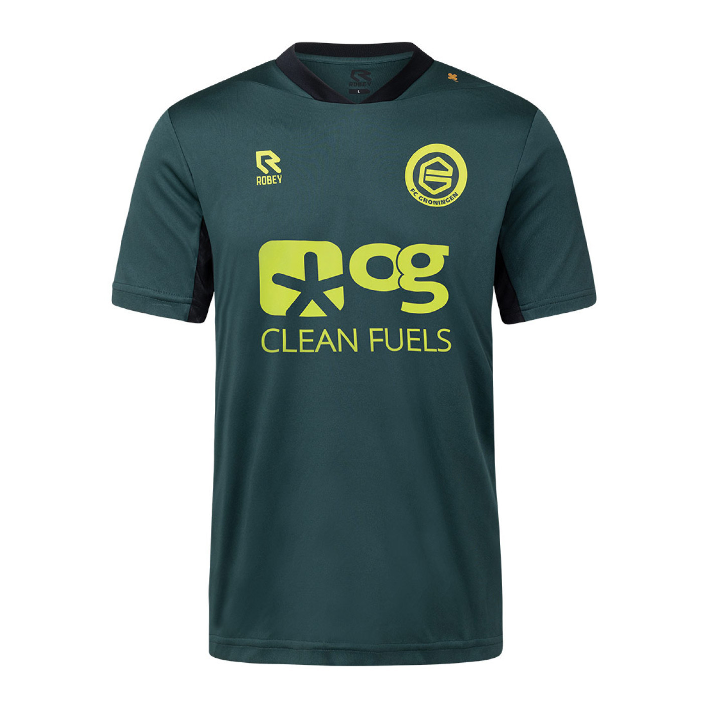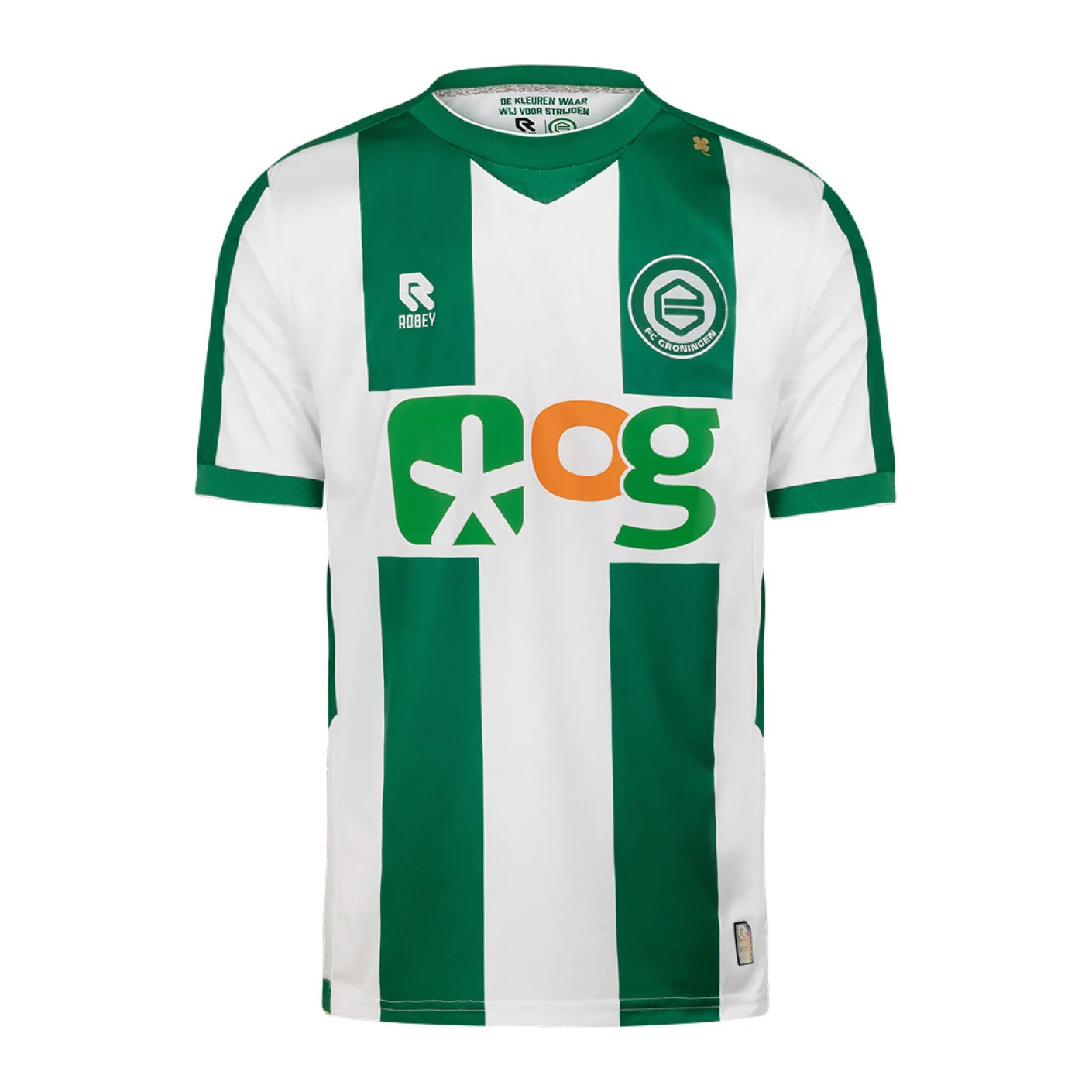 Check hier het nieuwste FC Groningen voetbalshirt, thuisshirt en uitshirt voor dit seizoen. Ook dit seizoen zijn de Noorderlingen weer actief in de Eredivisie en KNVB Beker. Het stadion van FC Groningen heet het Euroborg Stadion. Vanaf 2015-2016 is het Nederlandse voetbalmerk Robey de kledingsponsor van FC Groningen en verzorgt de voetbalshirts en trainingskleding van de club uit het Noorden. Dit zal vanaf het seizoen 2017-2018 PUMA Football zijn. Het FC Groningen thuisshirt 2016-2017 is traditioneel overwegend wit en bevat twee groene banen over het shirt. Verder wordt het shirt gekenmerkt door de klassieke kraag en de groene bies Het FC Groningen uitshirt voor 2016-2017 is overwegend groen en wordt gekenmerkt door de all-over print van het wapen van de stad Groningen over het shirt. Verder zijn beide voetbalshirts voorzien van het FC Groningen logo en het embleem van het stadswapen van FC Groningen. Bovendien bevatten beide voetbalshirts van de plaatselijke FC de leus van de club aan de binnenkant van de kraag: ''Trots van het Noorden''. De hoofdsponsor van FC Groningen is Essent en staat op het midden van de FC Groningen voetbalshirts. Check hier het laatste nieuws over het voetbalshirt van FC Groningen en meer informatie over waar je het shirt kunt kopen! Voetbalshirts.com, het meest uitgebreide nieuws over het FC Groningen voetbalshirt!