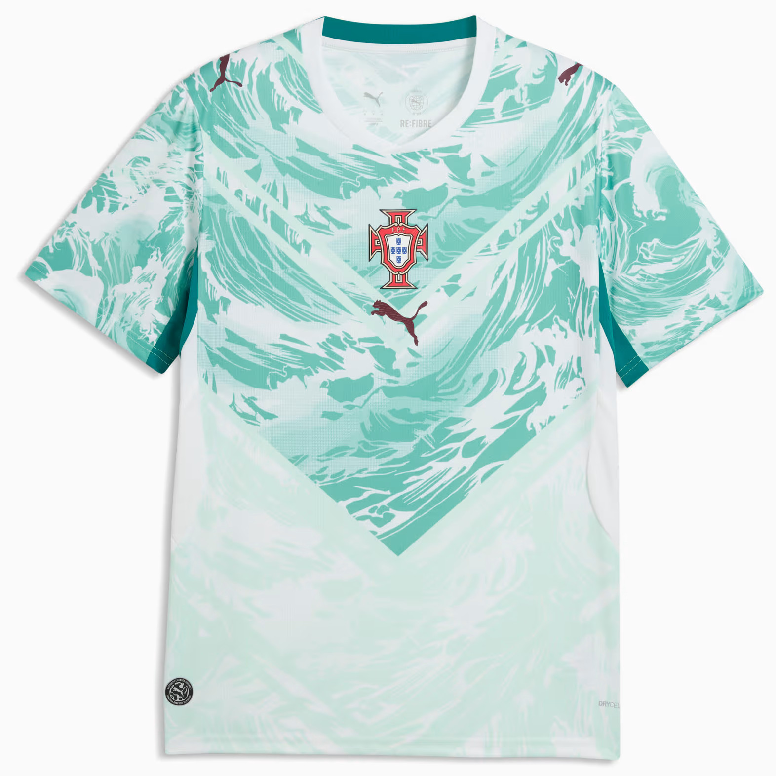 Bestel het nieuwste Portugal voetbalshirt altijd via voetbalshirts.com! In deze voetbalshirts speelt het Portugese (mannen- en vrouwenteam) de kwalificatie- en oefenwedstrijden ter voorbereiding op een WK of EK, alsook de interlands tijdens het wereldkampioenschap en Europees kampioenschap voetbal. Deze tenues worden ook gedragen tijdens de Nations League wedstrijden. Waar het Portugese elftal tijdens de eerste interland nog een wit/zwart, droeg het nationale team tijdens de Olympische Spelen in 1928 een donker rood voetbalshirt met en blauw voetbalbroekje en witte sokken. Tijdens de jaren ’40 en ’50 was het voetbalshirt ook bordeaux rood met een blauw voetbalbroekje en blauwe of rode sokken. In de jaren ’60 veranderde de kleur van het voetbalbroekje in het wit en de sokken naar groen. Sinds de jaren ’80 draagt het nationale team vrijwel altijd een rood voetbalshirt met een groen of rood voetbalbroekje en rode sokken. De tint rood van het voetbalshirt kan verschillen. Portugal heeft in het verleden helder rode voetbalshirts gedragen, maar ook bordeaux rode tenues. Het uitshirt van Portugal is vaak wit of turquoise en tijdens een aantal seizoenen droeg het land ook een zwart uitshirt. Marlec was in 1966 de eerste kledingsponsor van het Portugese voetbalelftal en daarna volgden Adidas (1978-1994), Olimpic (1995-1996) en Nike (1997-2025). Check hier de beschikbare Portugal voetbalshirts, alsook de historie van het shirt en tenue. Of check hier de nieuwste trainingskleding, zoals het trainingspak, het trainingspak en goedkope t-shirts of de officiële bedrukkingen van alle spelers!